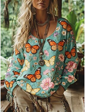 Per donna Blusa Stampato Floreale Grafico Bohemien Vintage Quotidiano Manica 3/4 Scollo a V Top Regolari Quotidiano Ferie Abbigliamento da vacanza Blu Rosa Viola Beige Estate Primavera Autunno