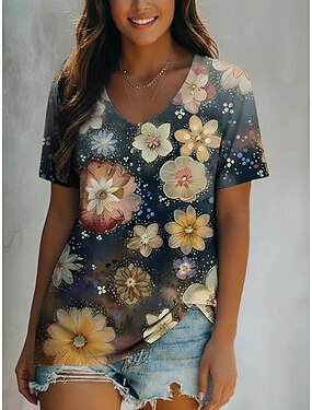 Per donna Maglietta Stampato Floreale Grafico Elegante Casual Manica Corta Girocollo Top Regolari Quotidiano Blu Nero Viola Estate Primavera