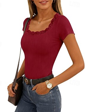 Per donna Maglietta Top estivi Pizzo Patchwork Semplice Elegante Moda Classico Manica Corta Collo quadrato Top Regolari Quotidiano Uscire Weekend Blu Bianco Rosa Rosso Cachi Estate Primavera