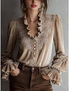 Per donna Camicia Velluto Camicia casual Camicia con volant Ricamato Bottoni Semplice Elegante Classico Casual Manica Lunga Scollo a V Top Regolari Quotidiano Ferie Uscire Beige Primavera Autunno