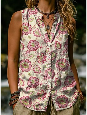 Per donna Camicia Bottoni Stampato Floreale Grafico Vintage Elegante Moderno Senza Maniche Collo alla coreana Top Regolari Casuale Quotidiano Giallo Rosa Estate Primavera