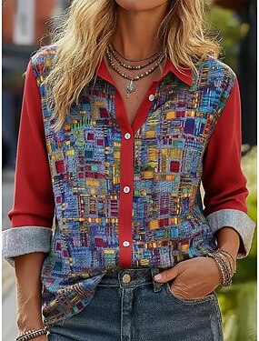 Per donna Camicia casual Blusa Arricciato Patchwork Stampato Floreale Grafico Elegante Attivo Vacanza Manica Lunga Colletto a Camicia Top Regolari Quotidiano Ferie Uscire Mattone rosso Estate