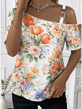Per donna Maglietta Stampato Floreale Grafico Moda Classico Casual Manica Corta Monospalla Top Regolari Quotidiano Uscire Weekend Rosa Viola Verde Estate Primavera