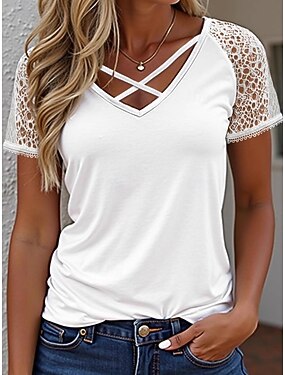 Per donna Camicia Blusa Pizzo Tinta unica Elegante Casual Manica Corta Scollo a V Top Regolari Casuale Quotidiano Nero Bianco Rosa Viola Arancione Estate Primavera