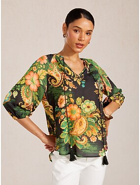camicetta con maniche a pipistrello in raso setoso con motivo floreale e uccellino