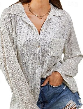 Per donna Camicia Top con paillettes Paillettes Bottoni Semplice Vintage Elegante Manica Lunga Colletto a Camicia Top Regolari Quotidiano Ferie Uscire Nero Argento Champagne Autunno Inverno