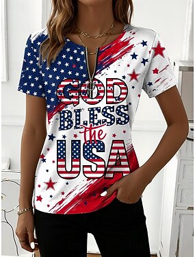 Giorno dell'Indipendenza Americana Per donna Maglietta Cerniera Grafico Bandiera Americana Elegante Classico Casual Manica Corta Girocollo Top Regolari Quotidiano Weekend Blu Bianco Rosso Estate