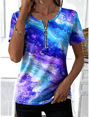 Per donna Maglietta Cerniera Grafico Geometrico Astratto Vintage Hawaiano Elegante Manica Corta Girocollo Top Regolari Quotidiano Sportivo Weekend Blu Rosso Viola Verde Estate Primavera