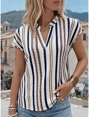 Per donna Maglietta Stampato A righe Moda Elegante Classico Manica Corta Scollo a V Top lunghi Quotidiano Uscire Weekend Rosso Cachi Estate Primavera