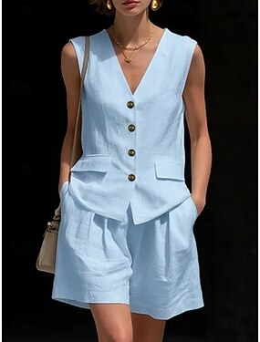 Per donna Set di Pantaloncini Finto cotone e lino Senza Maniche Scollo a V Tinta unica Moda Streetwear Casuale Quotidiano All'aperto Blu Nero Bianco Estate Vestibilità regolare