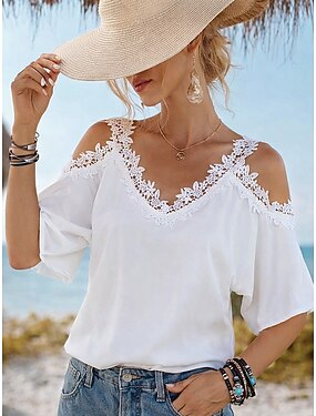 Per donna Top con cuciture in pizzo Blusa Pizzo Patchwork Tinta unica Elegante Essenziale Casual Manica Corta Scollo a V Top Regolari Quotidiano Blu Bianco Rosa Estate Primavera