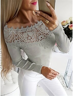 Per donna Maglietta Top con cuciture in pizzo Pizzo Patchwork Tinta unica Elegante Moda Classico Manica Lunga Senza Spalle Top Regolari Quotidiano Uscire Weekend Grigio Estate Primavera