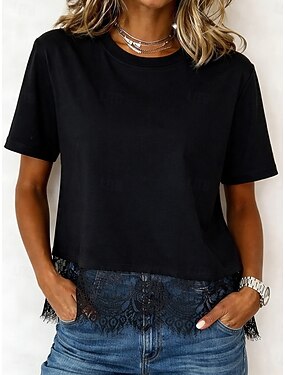 Per donna 100% cotone Pizzo a contrasto Elegante Classico Manica Corta Girocollo Top Regolari Casuale Nero Bianco Estate Primavera