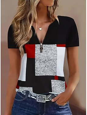 Per donna Maglietta Blocco di colore Zip a un quarto Grafico A righe Vintage Tropicale Hawaiano Manica Corta Girocollo Top Regolari Matrimonio in Spiaggia Quotidiano Sportivo Nero Verde Estate