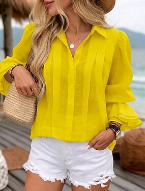 Per donna Blusa Arricciato Bottoni Tinta unica Elegante Casual Manica Lunga Colletto a Camicia Top Regolari Quotidiano Verde salvia Nero Rosso Blu marino Albicocca Primavera Autunno Inverno