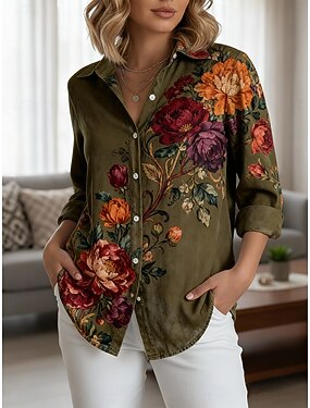 Per donna Camicia Bottoni Stampato Floreale Elegante Casual Manica Lunga Colletto a Camicia Top Regolari Quotidiano Lavoro Ferie Vino Blu marino Verde Primavera Autunno