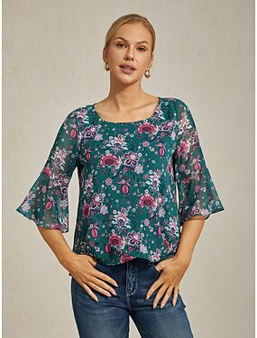 Per donna Top Eleganti Floreale Elegante Manica a Volant Girocollo Quotidiano Ospite di nozze Blu marino Primavera, Autunno, Inverno, Estate