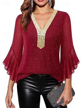 Per donna Blusa Top con paillettes Patchwork Blocco di colori Elegante Moderno Manica 3/4 Manica a Campana Scollo a V Top Regolari Quotidiano Ferie Uscire Blu Nero Rosso Viola Verde Estate Primavera