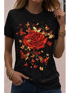 Per donna Maglietta Stampato Floreale Elegante Classico Casual Manica Corta Girocollo Top Regolari Quotidiano Nero e rosso Verde e blu Blu nero Estate Primavera