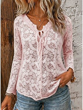 Per donna Camicia di Pizzo Blusa Nodo frontale Pizzo Tinta unica Elegante Essenziale Casual Manica Lunga Cravatta al collo Top Regolari Quotidiano Lavoro Blu Nero Rosa Primavera Autunno