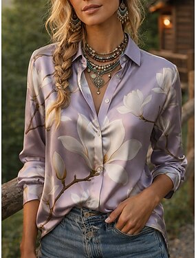 Per donna Camicia Camicia in raso Stampato Floreale Grafico Vacanza Moda Quotidiano Manica Lunga Colletto a Camicia Top lunghi Quotidiano Ferie Uscire Viola Estate Primavera Autunno