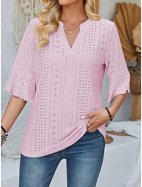 Per donna Blusa Traforato Tinta unica Quotidiano Elegante Essenziale Manica 3/4 Scollo a V Top Regolari Quotidiano Blu Nero Bianco Giallo Rosa Estate Primavera Autunno