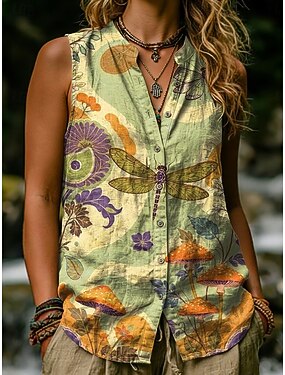 Per donna Camicia Bottoni Stampato Floreale Grafico Vintage Elegante Moderno Senza Maniche Collo alla coreana Top Regolari Casuale Quotidiano Giallo Rosa Estate Primavera