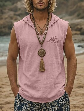 Gilet da uomo senza maniche con cappuccio, stile boho costiero vintage, con stampa a onde oceaniche, vestibilità ampia, scollo a V, orlo sfrangiato, cotone e lino, ideale per vacanze al mare e surf,