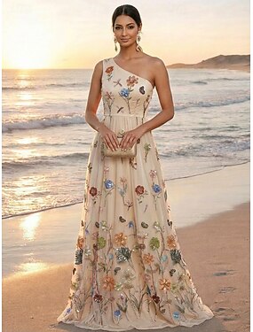 Linea ad A Lunghezza al pavimento Vestito maxi Vestito da Festa Abito da Cocktail Abito da Sera Elegante Vintage Brillanti Senza Maniche Monospalla Formale Ospite di nozze Misto Cotone Con Paillettes