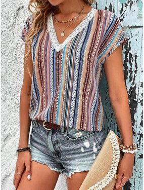 Per donna Blusa Top in chiffon Top in pizzo Pizzo Floreale Elegante Moderno Manica Corta Scollo a V Top lunghi Casuale Ferie Estate Blu Bianco Rosa Arancione Verde Estate Primavera