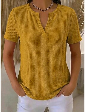 Per donna Maglietta Waffle Maglietta Tinta unica Elegante Casual Manica Corta Scollo a V Top Regolari Quotidiano Uscire Nero Giallo Vino Grigio Estate Primavera