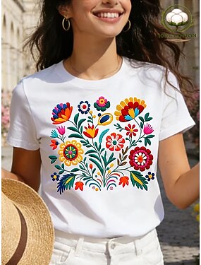Per donna 100% cotone Maglietta Stampato Floreale Grafico Vintage Elegante Classico Manica Corta Girocollo Top Regolari Casuale Quotidiano Uscire Bianco Estate Primavera