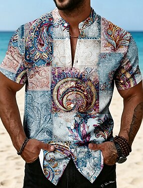 Per uomo Camicia di lino Camicia popover Camicia Estiva Abbigliamento da spiaggia Camicia vintage Camicia etnica Floreale Vacanza Casuale Giallo Blu Arancione Marrone Manica Lunga Scollo a V Estate