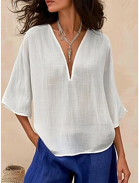 Camicia da Donna in 100% Cotone Camicia in Lino Camicia Estiva Camicia da Spiaggia Bottoni Semplice Giornaliera Stilosa Casual Manica 3/4 Collo a V Giornaliero Vacanza Indossabile Bianca Estate