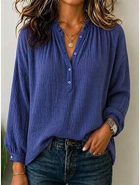 Per donna Misto cotone Camicia Boho Blusa Quotidiano Casual Manica Lunga Scollo a V Top Regolari Champagne Giallo Rosa Azzurro cielo Viola Estate Primavera Autunno