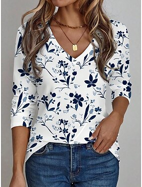 Per donna Maglietta Stampato Grafico Piante Vintage Elegante Casual Manica Lunga Scollo a V Top Regolari Quotidiano Blu Cachi Autunno Inverno