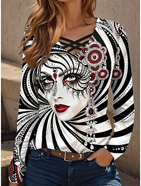 Carnevale Martedì grasso Per donna Maglietta Taglio Stampato Grafico Astratto Vintage Elegante Classico Manica Lunga Scollo a V Top Regolari Quotidiano Nero Verde Primavera Autunno