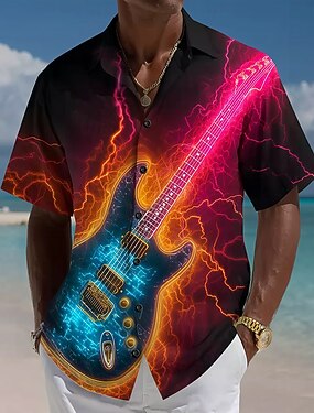 Per uomo Fulmini Chitarra Strumento musicale Camicia Camicia Estiva Camicia con Bottoni Manica Corta Vintage Retrò All'aperto Festival Musicale Vacanza al Mare Estate Primavera Collo ripiegato Stampa