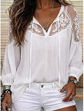Per donna Blusa Top in pizzo Patchwork Traforato Semplice Elegante Vacanza Vintage Manica Lunga Scollo a V Top Regolari Quotidiano Ferie Uscire Nero Bianco Estate Primavera Autunno