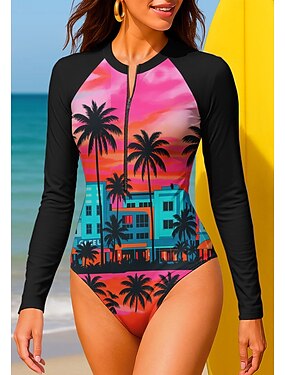 Per donna Standard Top sottomuta Costume da bagno Costume Intero Tropicale Color-blocking con reggiseno incorporato UPF50+ Protezione UV Elastico Manica Lunga Costume da Bagno Body Surf Spiaggia