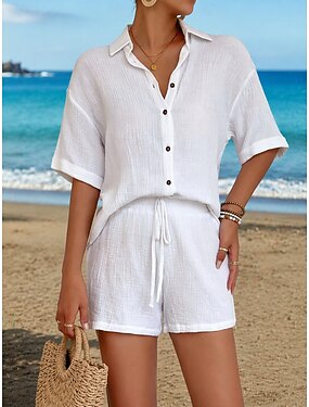Per donna Set di Pantaloncini Manica Corta Colletto a Camicia Tinta unica Moda Streetwear Casuale Quotidiano All'aperto Nero Bianco Estate Vestibilità regolare