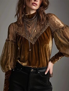 Per donna Velluto Blusa Top Eleganti Top in pizzo Arricciato Pizzo Bottoni Semplice Elegante Quotidiano Signore Manica Lunga Collo Alto Top Regolari Quotidiano Lavoro Ferie Marrone Autunno Inverno