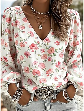 Per donna Blusa Floreale Quotidiano Elegante Casual Manica Lunga Scollo a V Top Regolari Quotidiano Verde salvia Bianco Verde chiaro Rosa Rosso Estate Primavera Autunno