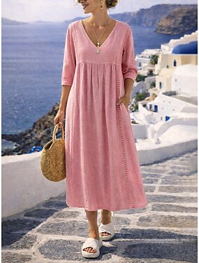 Per donna Abito Midi Finto cotone e lino Vestito Casual Elegante Moda Moderno All'aperto Vacanza Uscire Vestibilità comoda Semplice Manica Corta Scollo a V Blu Bianco Verde Grigio Estate Primavera