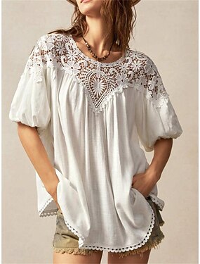Per donna Top estivi Blusa Top in pizzo Arricciato Pizzo Patchwork Semplice Elegante Tropicale Signore Manica Corta Manica a Lanterna Girocollo Top Regolari Quotidiano Lavoro Ferie Bianco Giallo