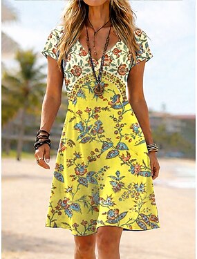 Per donna Abito al ginocchio Vestito Estivo Vestito T-Shirt Abito a trapezio Vacanza Casual Boho Spiaggia Vestibilità regolare Floreale Grafico Manica Corta Scollo a V Blu Giallo Rosa Verde Estate