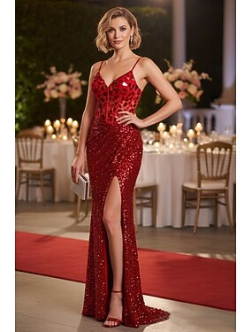 Abiti Sirena Trumpe Quinceanera Elegante Abito Formale Matrimonio Lunghezza Pavimento Senza Maniche Collo a V Paillettato con Paillettes