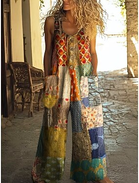 Tuta Attiva in Lino da Donna Grafica Floreale Senza Maniche Gamba Larga Collo Rotondo Patchwork Quotidiano Vacanza Vestibilità Larga Marrone Chiaro Arancione Estate