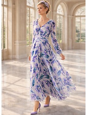 Linea ad A Lunghezza alla caviglia Abito da invitata a nozze Abito Formale Abito da sera Abito da cerimonia per signora Manica Lunga Scollo a V Bavero Elegante Vintage Formale Ospite di nozze Nylon