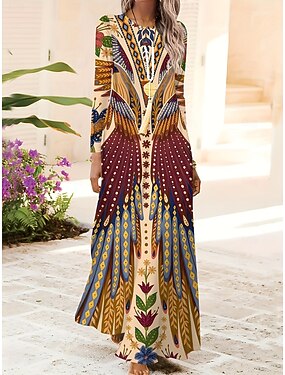 Per donna Abito maxi Tubino Abito a trapezio Casual Boho Ospite di nozze Spiaggia Vestibilità regolare Floreale Grafico Uccello Manica Lunga Girocollo Giallo Primavera Autunno Inverno